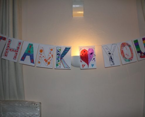 The village hall was provided as an operation base. Children of the village made a sign expressing their thanks for our efforts. The sign was erected in the village hall during the works.
